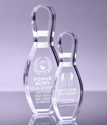 A beautiful expertly cut piece of clear acrylic in the shape of a bowling pin. Use your logo to make this a special award for any accomplishment!