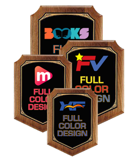 Beautiful American Walnut Shield Shaped Plaques with Black Brass Gold Border. Printed border plate.