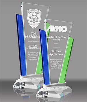 This awesome crystal award will be a standout at your next event. Blue and Green crystal uprights standing atop a diamond base.