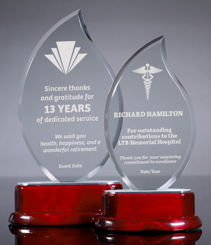 These beautiful jade crystal flames sit upon a rounded mahogany base.
