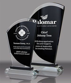 Sail-Shaped Glass Award with Black Center on Glass Base with Black Pedestal. 3/8" thick glass silk screened black.