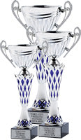 These beautiful cups unique design and blue accents make it a standout at any event. The Metal Cup on a plastic stem stands proudly on a Black Genuine Marble Base.