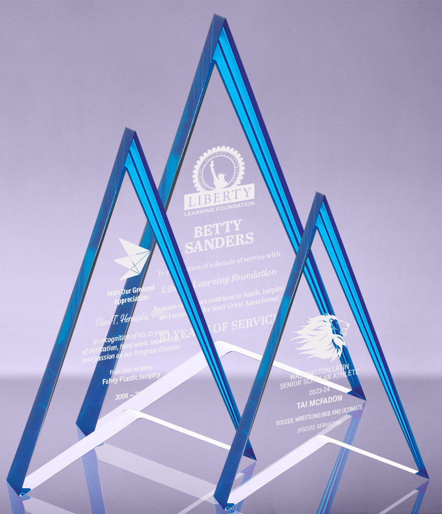 Free Standing Spearhead Series Clear Acrylic Awards with Blue Reflective Accents.