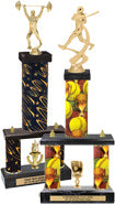 This impressive trophy comes with a two-column (your choice) foundation, a rectangle or oval center column (your choice), A black or white marble tone wood base and your choice of trim and figure.